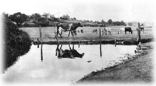 The first shows the farmhouse itself on the left in the distance, and was taken from somewhere around what is now the junction of West Way and Haverstock Rd, looking south west....